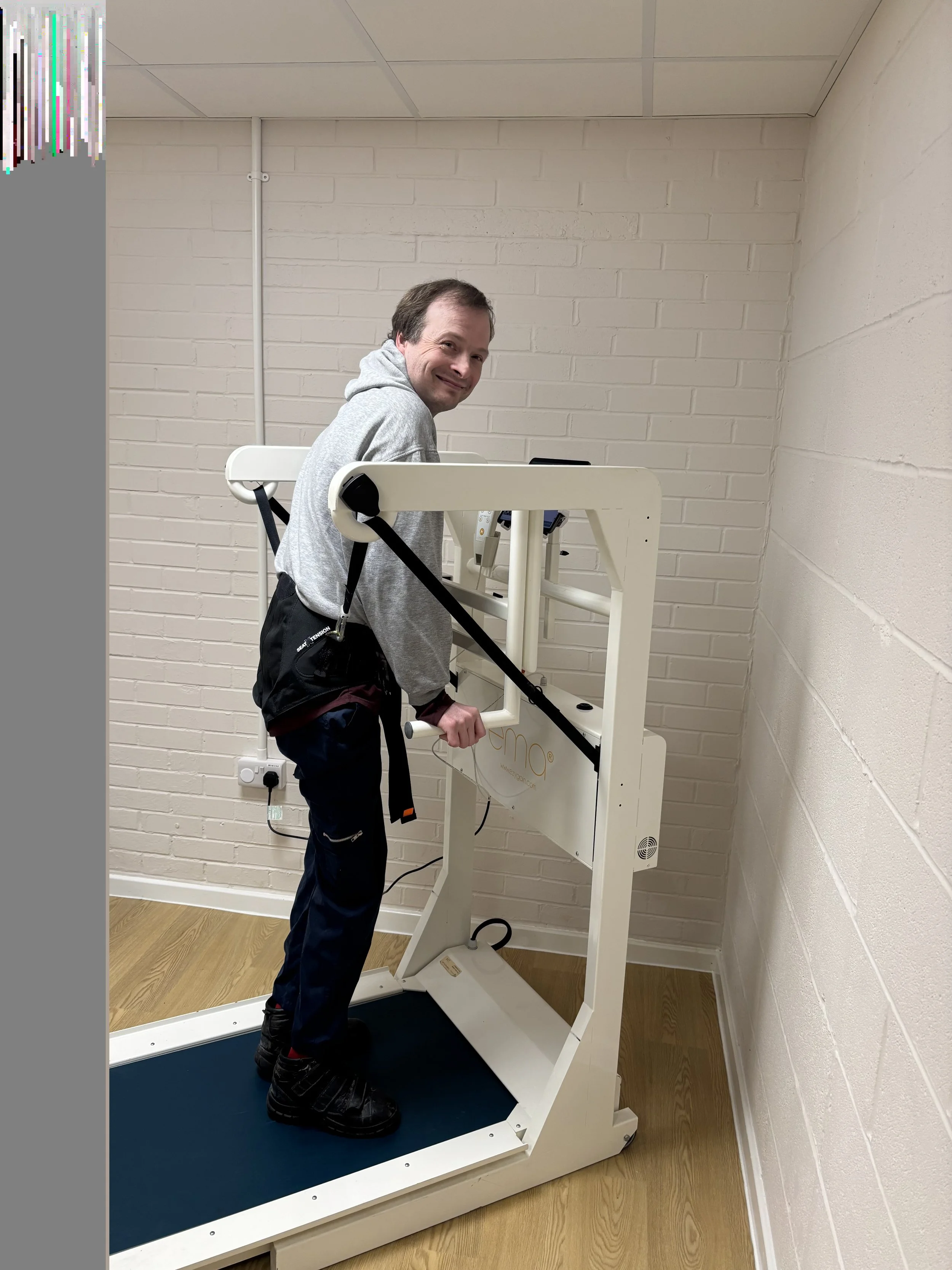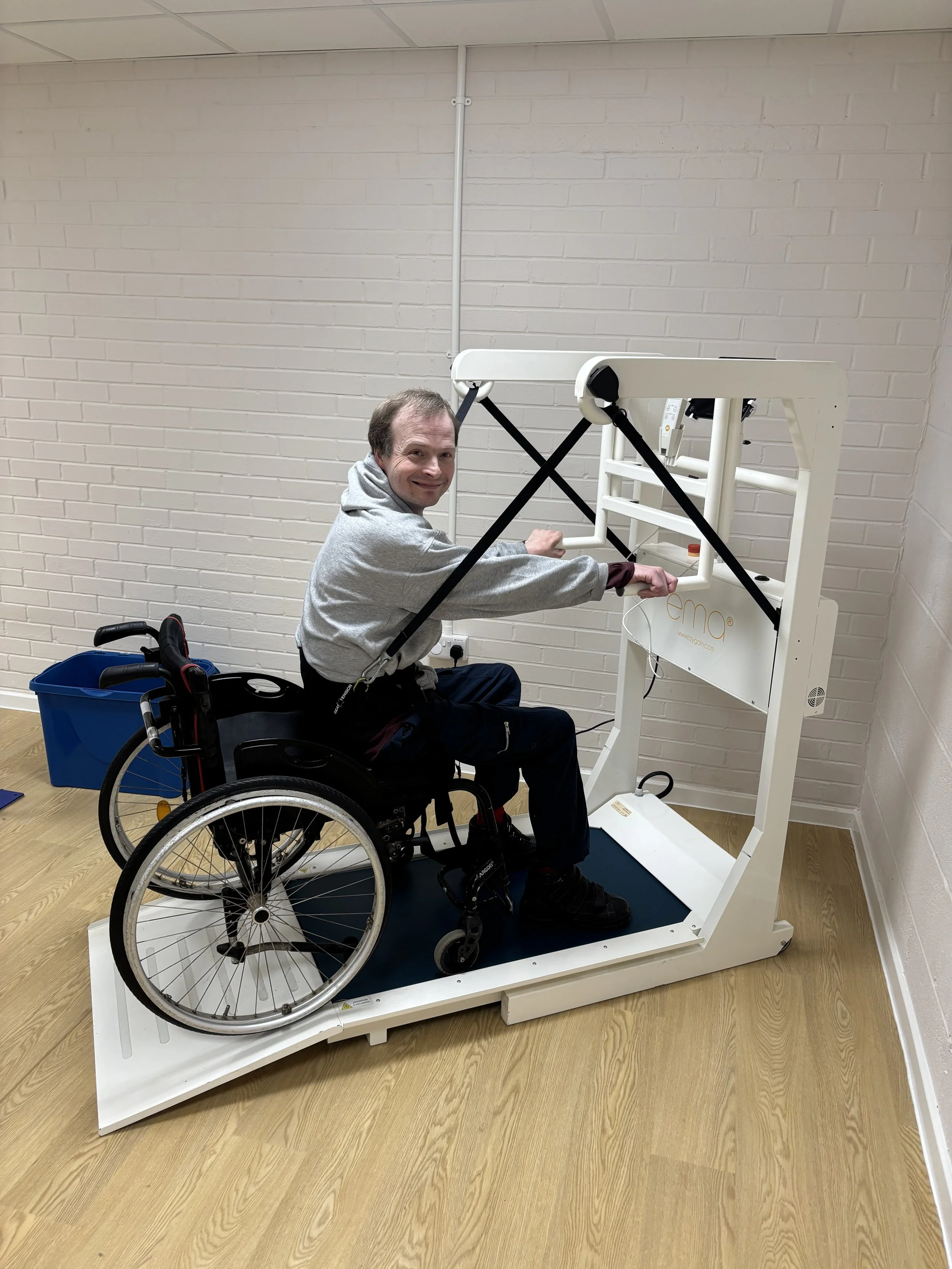 The arrival of the EzyGain ema® treadmill from Atelier Rehab marked a major breakthrough. Its unique design allowed Adam to wheel himself onto the treadmill using the integrated ramp. Once in position, the safety harness system enabled him to move from a sitting to a standing position comfortably and begin his walking therapy session.